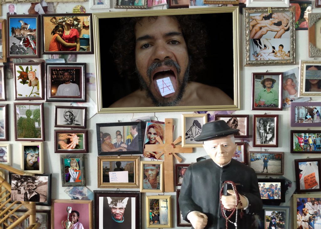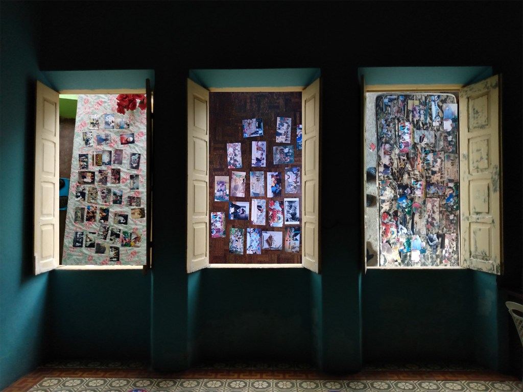 En los intervalos de tiempo dentro de cada uno, sombra y luz bordadas de genipap, un chivo grita dentro de mí, el rostro se multiplica colgado en el lienzo oscuro, un bendito, zoom… letanía, incelenza en el camino. El cordón rompe la incertidumbre. Mirar refleja el asombro de la imagen sobre el hormigón. Tierra protegida, seres demarcados, inscritos en la materia.