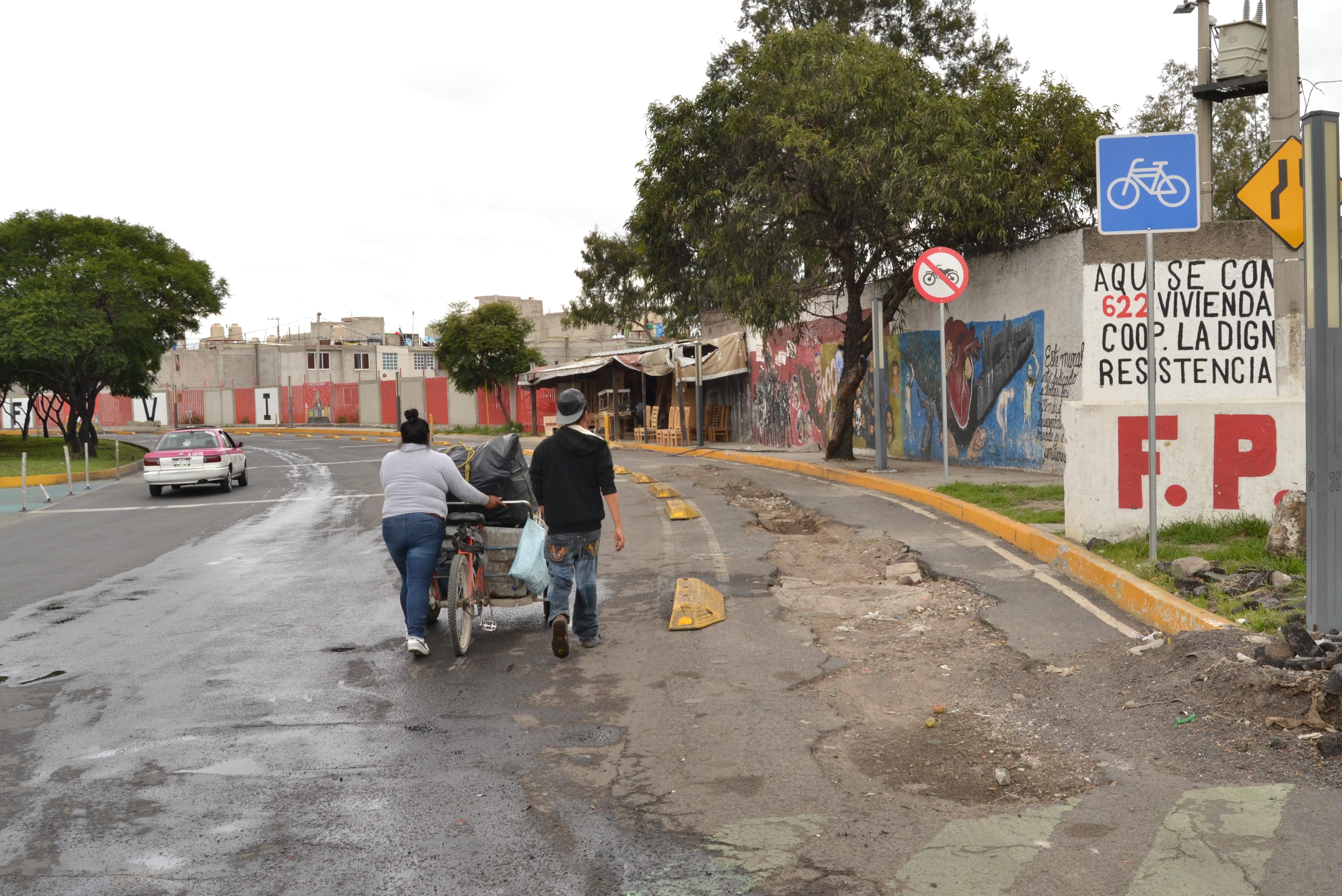Estas fotografías, tomadas durante visitas de campo a infraestructura ciclista periférica en estadías de investigación en la Ciudad de México y Toronto, representan algunas de las problemáticas, paradojas, y dificultades de las políticas y programas de expansión de redes ciclistas en estos territorios urbanos heterogéneos. Aunque puede ser obvio que metrópolis en otros extremos del continente difieren muchísimo, hay importantes coincidencias entre sus programas de mejoramiento de redes ciclistas, los cuales enfrentan el reto de expandir más allá de la zona central de la urbe e influir en las movilidades y formas urbanas periféricas. Estos ‘nuevos’ contextos para proyectos de infraestructura ciclista –sea el anillo de suburbios alrededor de Toronto o las urbanizaciones informales en los bordes de la Ciudad de México– ponen los establecidos modelos de reconfiguración infraestructural a prueba y hacen reflexionar sobre la adecuación de formas de gobernanza y procesos de ordenamiento a territorios heterogéneos.