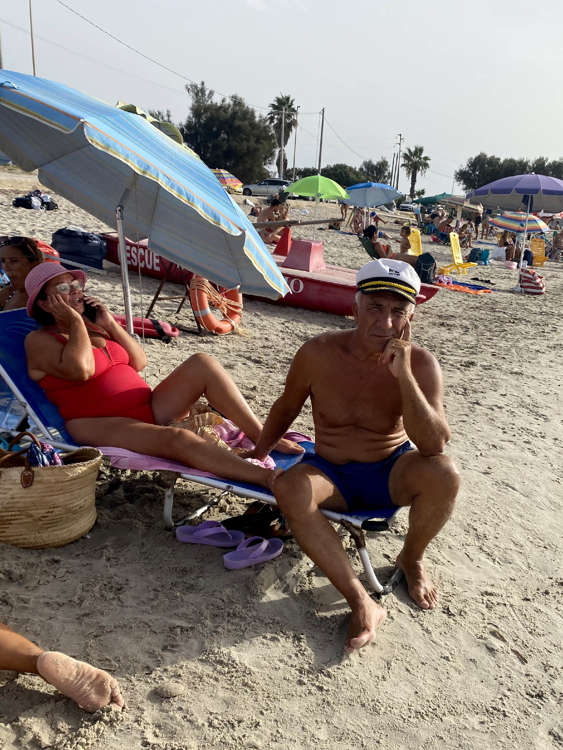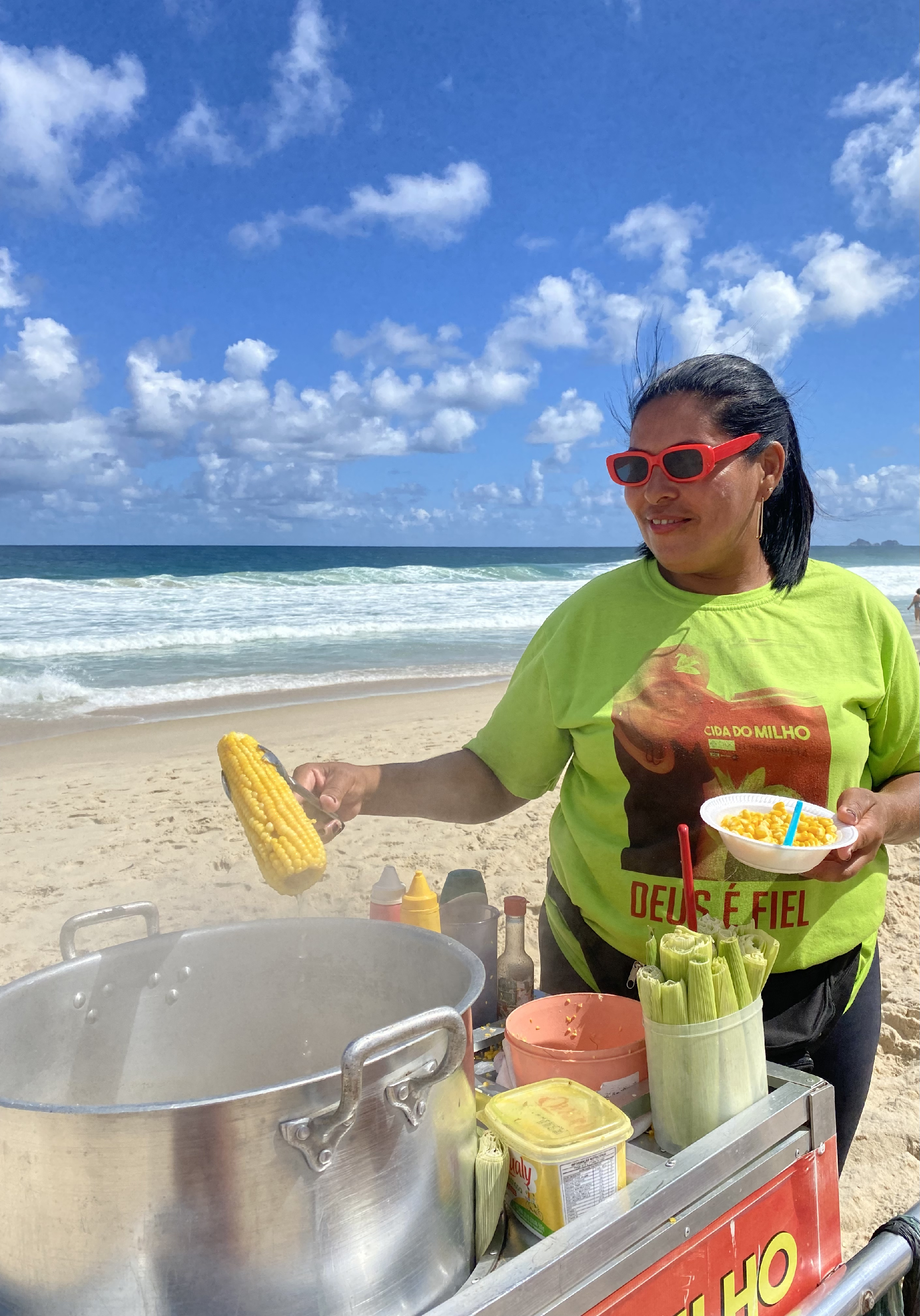 Name of the photos: Photo 1: Massages on the beach in Taormina. Photo 2: Bathed in sun and palm trees in Puerto Escondido. Photo 3: Milho, corn, choclo. Beach food. Photo 4: Disconnection in the beach chair. Photo 5: Italian family.