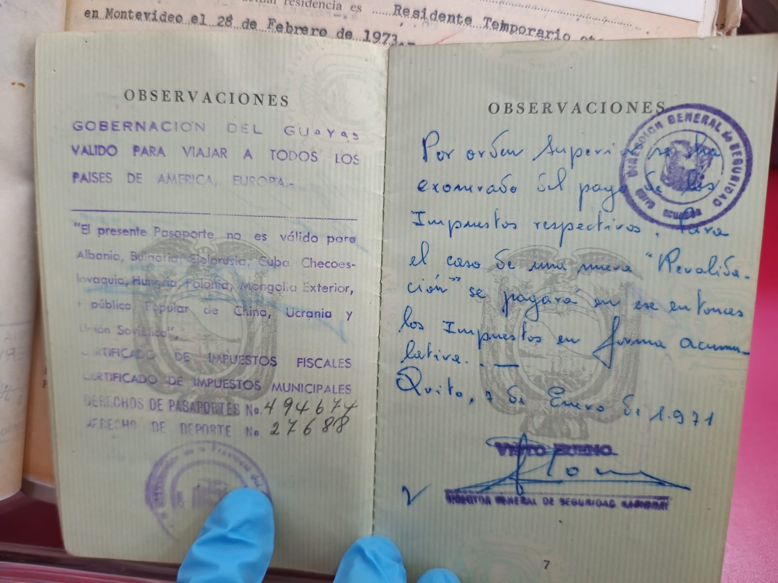 Name of the photos: 1. Description of documentation from the Foreigners Control Collection, Museo de la Memoria y los Derechos Humanos [Museum of Memory and Human Rights]. 2. Discovery of the passport of José Félix García, an Ecuadorian victim of forced disappearance, in the Archivo Nacional de Chile [National Archive of Chile]. 3. Review of documentation by graphic design students (Universidad Diego Portales) in the National Archives of Chile. 4. Digitalization machines working for the Repositorio Digital Público Archivo de Extranjería, Memoria y DDHH 1973-1990 [Public Digital Repository Immigration Archive, Memory and Human Rights 1973-1990]. 5. Exhibition of the Repositorio Digital Público Archivo de Extranjería, Memoria y DDHH 1973-1990, at the Sitio de Memoria José Domingo Cañas [José Domingo Cañas Memorial Site].